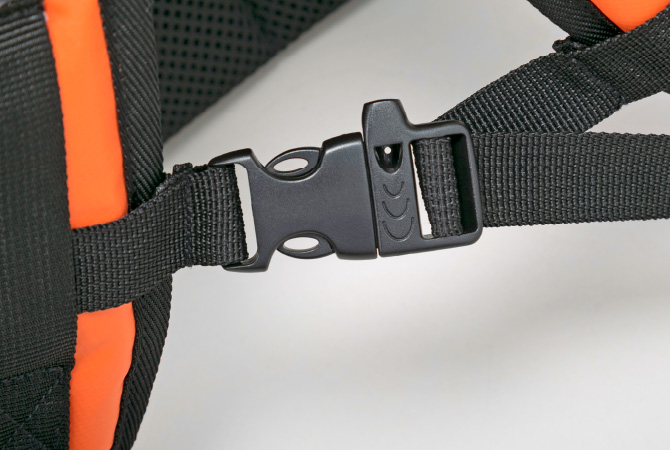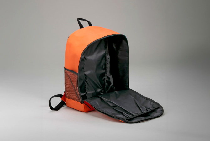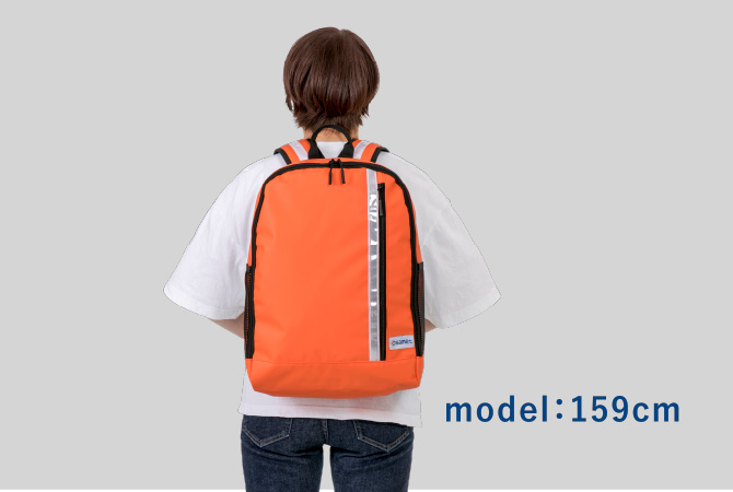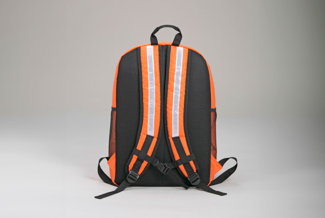 夜間も安心な反射板や、ホイッスルとして使えるフロントバック、つかみ易いファッショナブルなジッパータグや500mlペットボトルが余裕で入る大きさのメッシュ素材のサイドポケット付き。